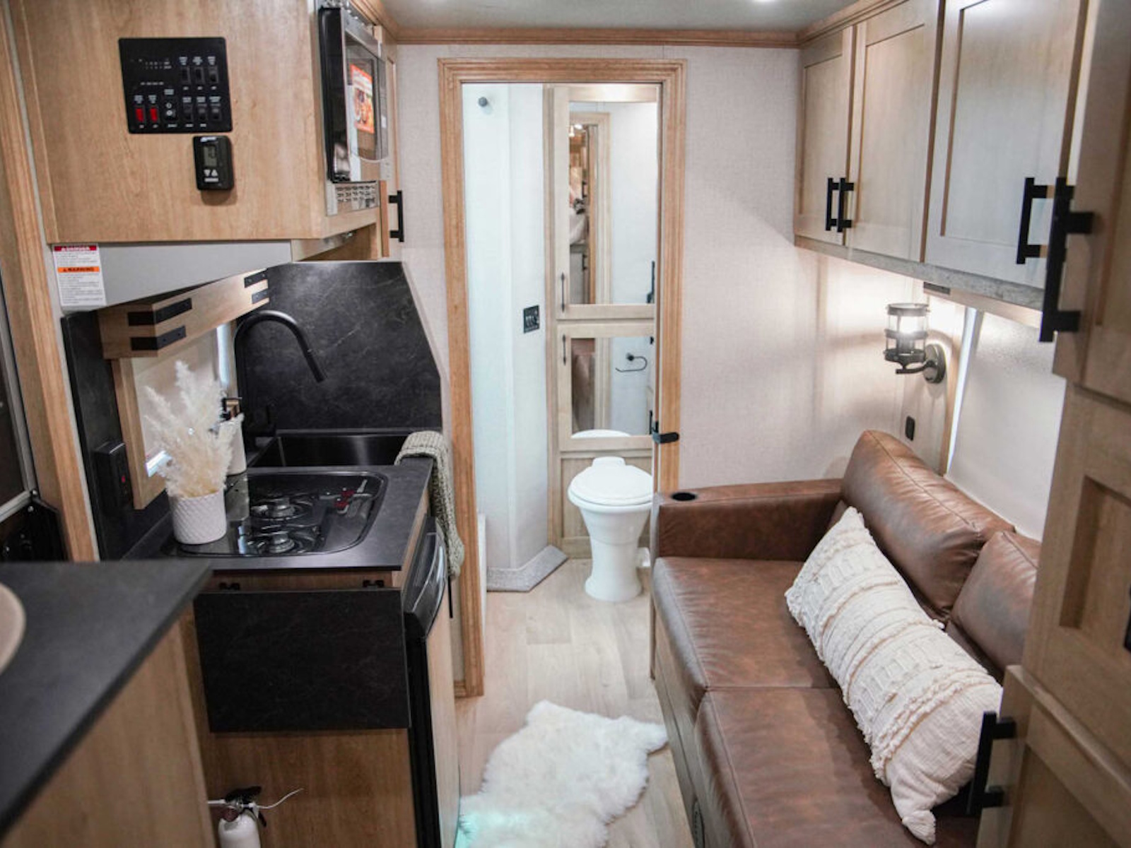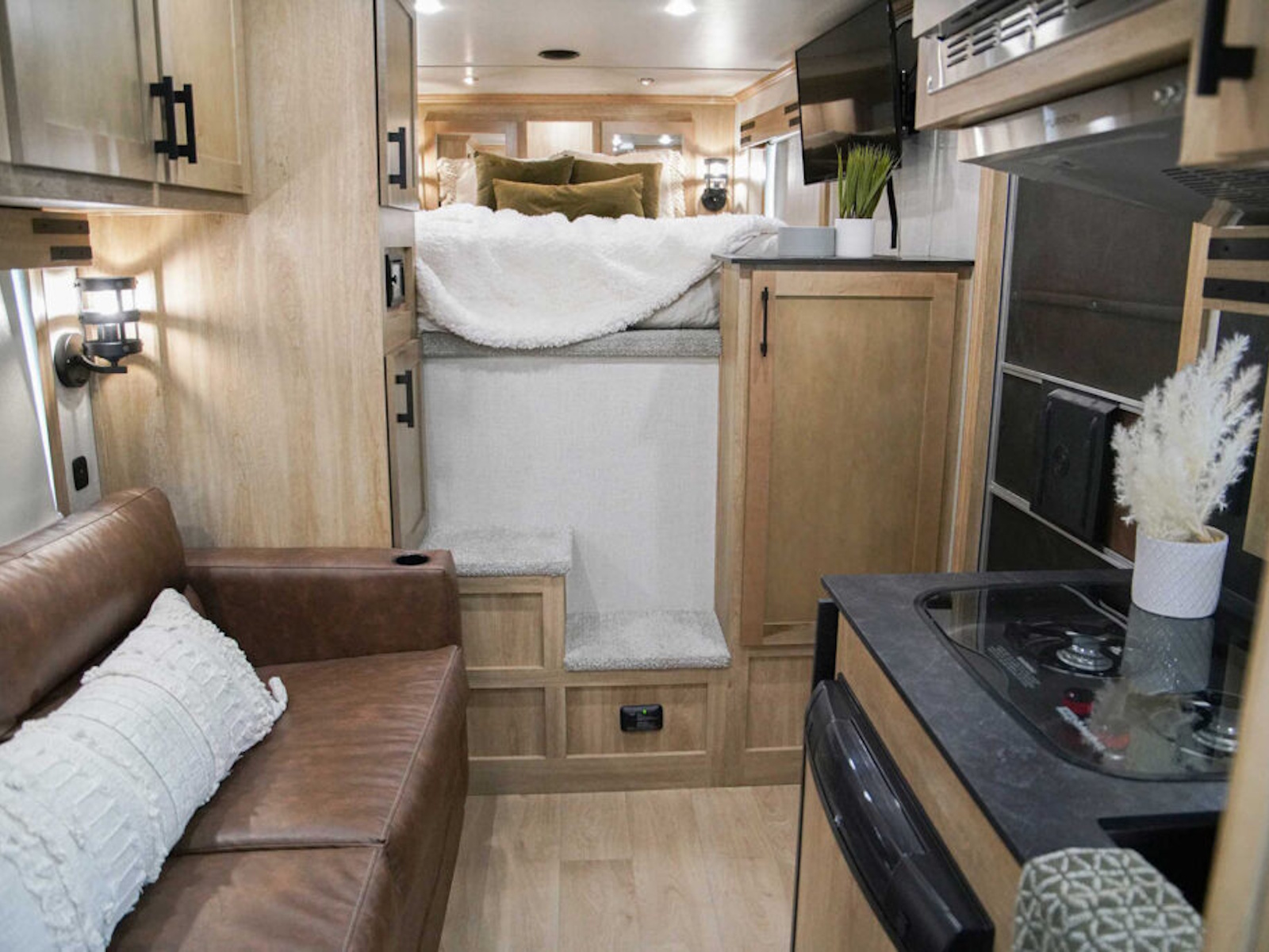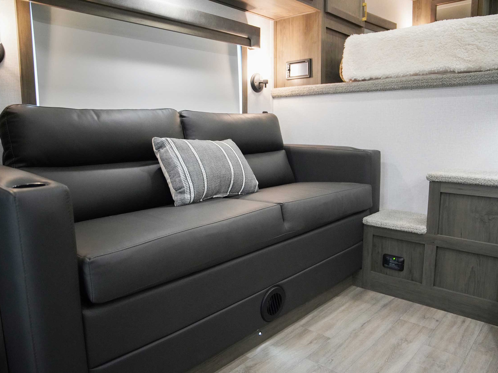 - Exiss living quarters now come with our redesigned sofas. These modern sofas feature cupholders with USB chargers behind the sofa. They easily fold down for extra sleeping space inside the interior.