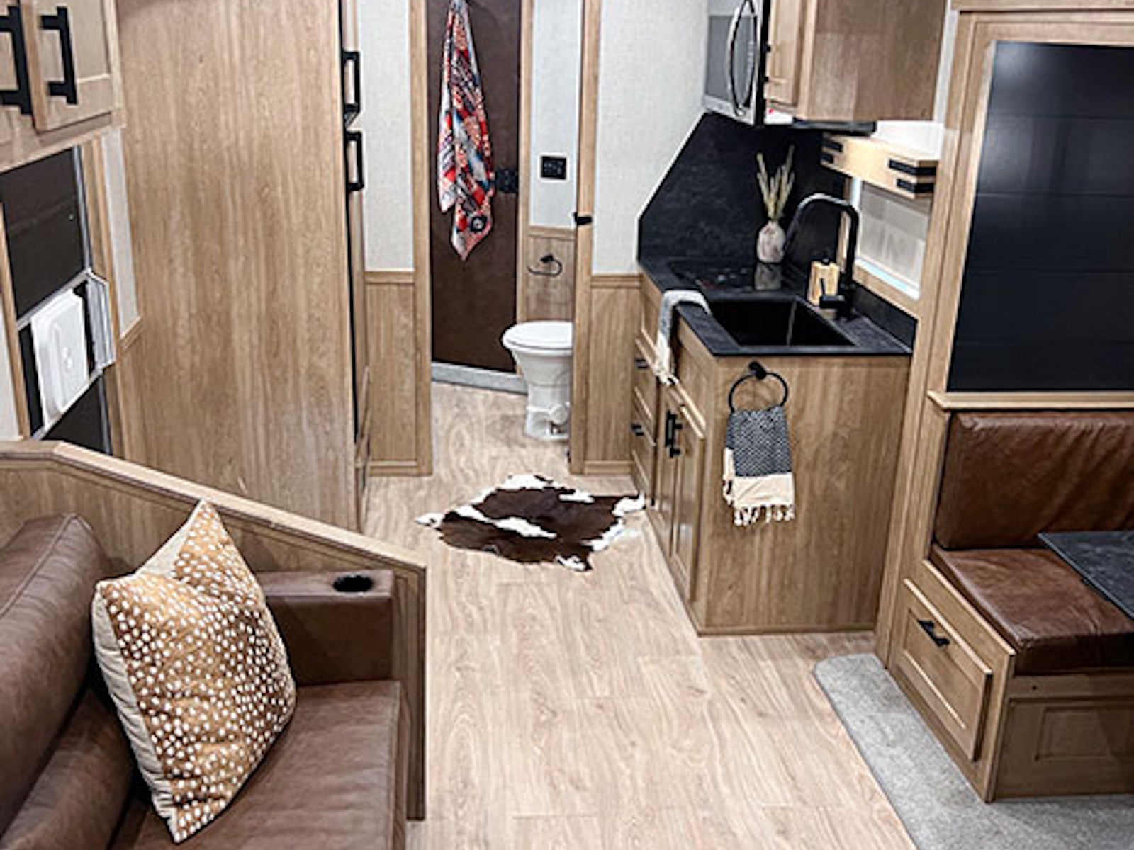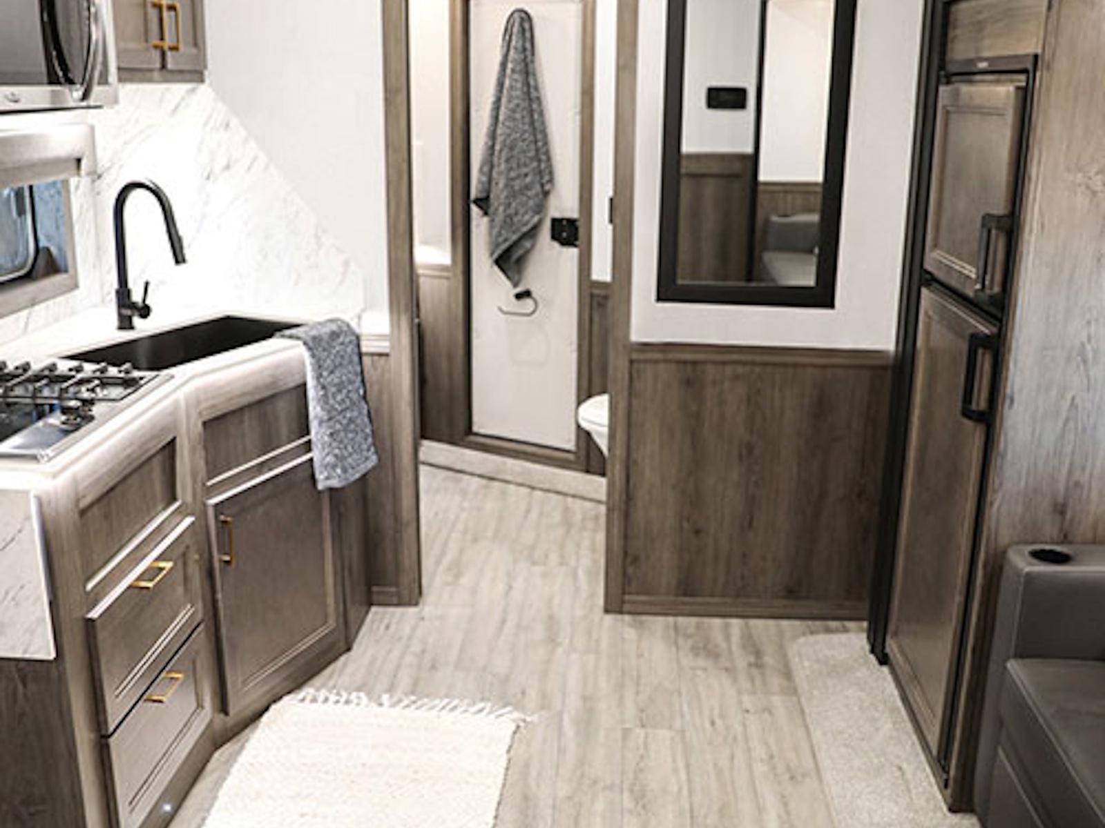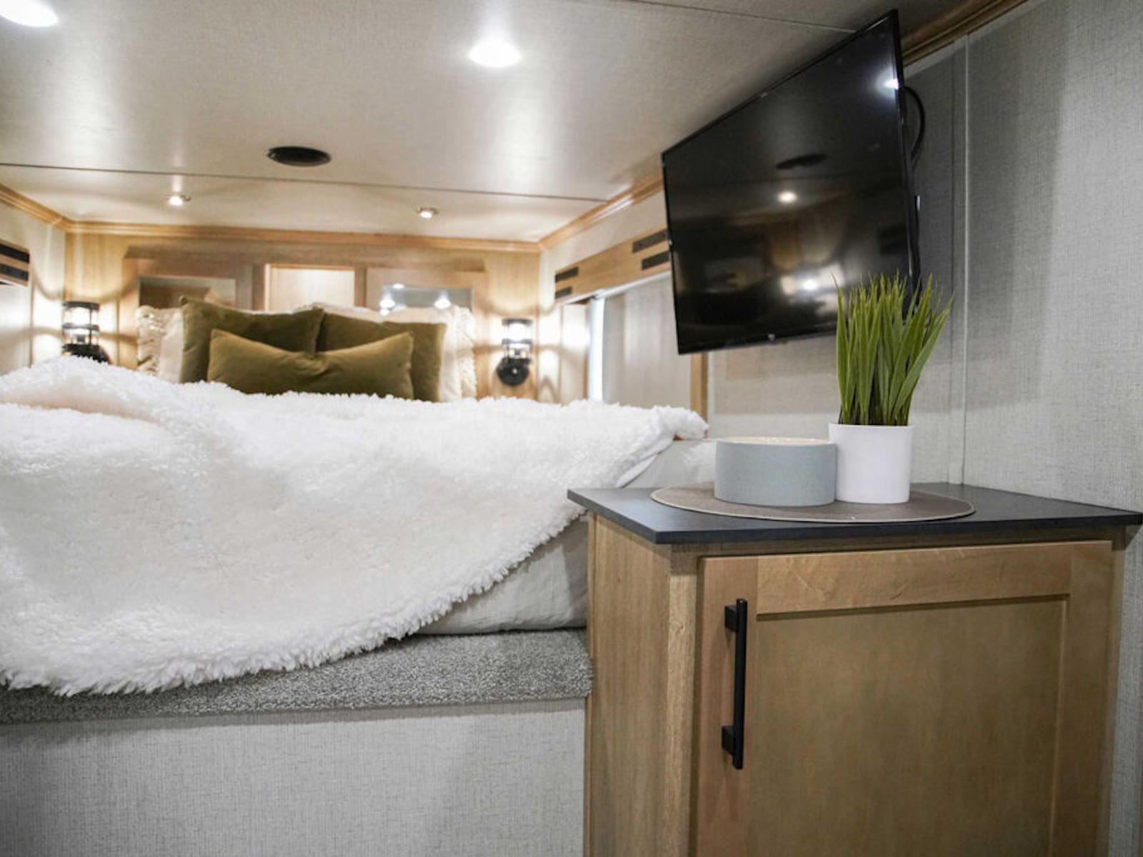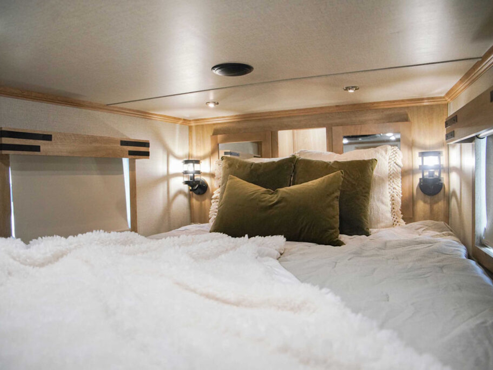 - Exiss living quarters now come with our redesigned sofas. These modern sofas feature cupholders with USB chargers behind the sofa. They easily fold down for extra sleeping space inside the interior.
