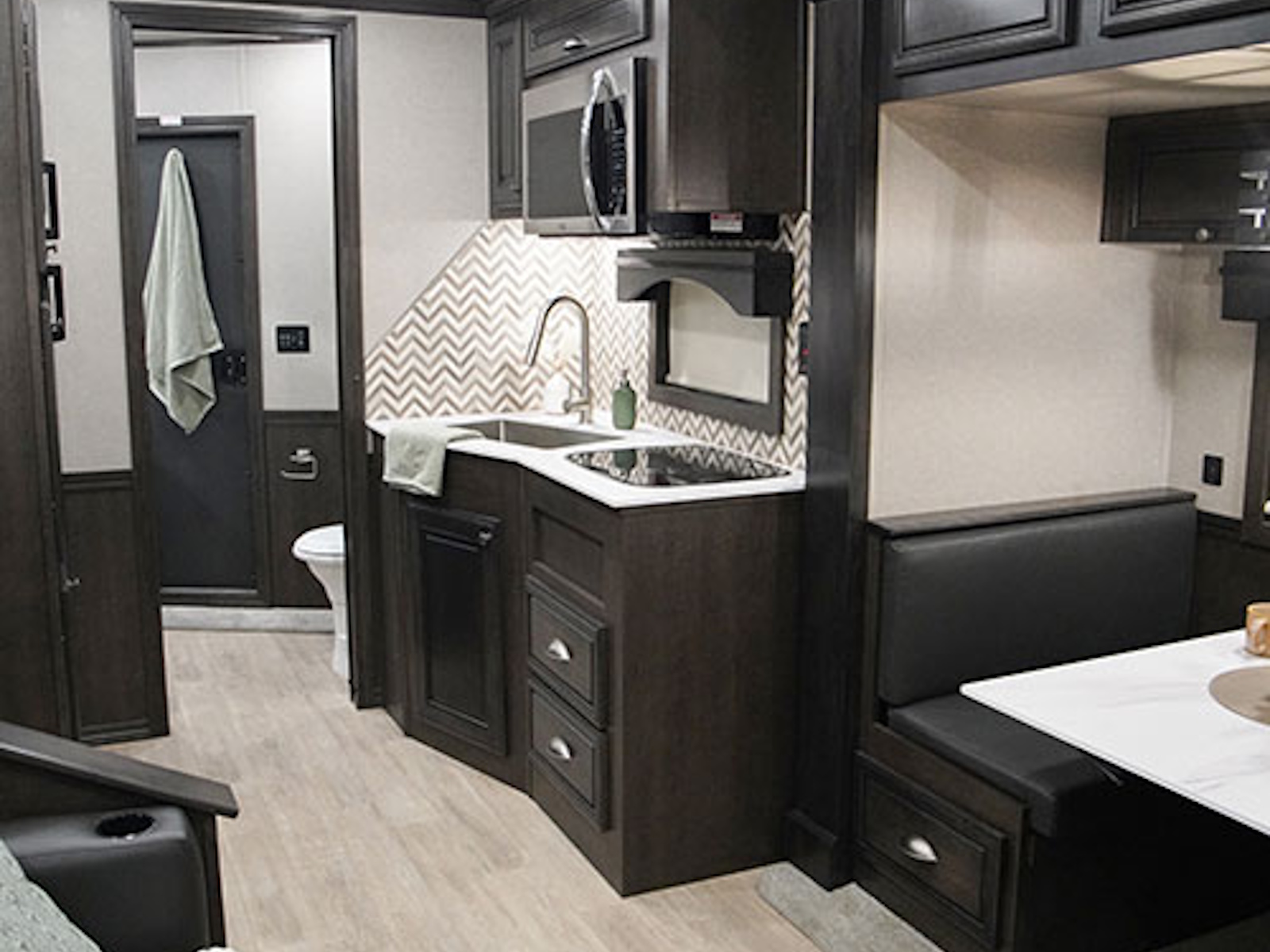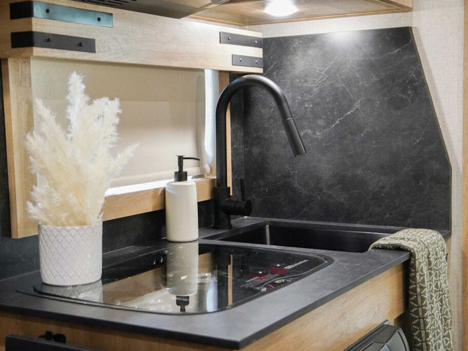 - Exiss living quarters feature an upgraded, larger convection microwave standard, which gives horse owners even more convenience and cooking options when traveling. The kitchen sink is a deep, extra large undermount style with stylish, upgraded faucets. And the recessed stainless steel cooktop stove is convenient and provides an additional flat surface for additional counter space.