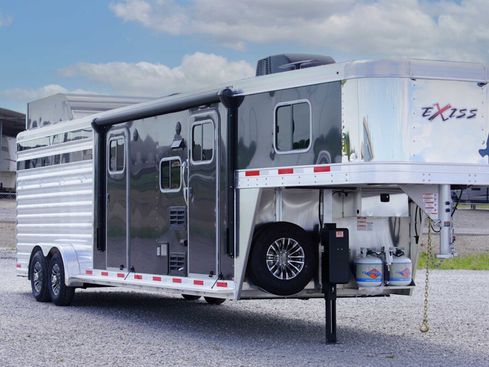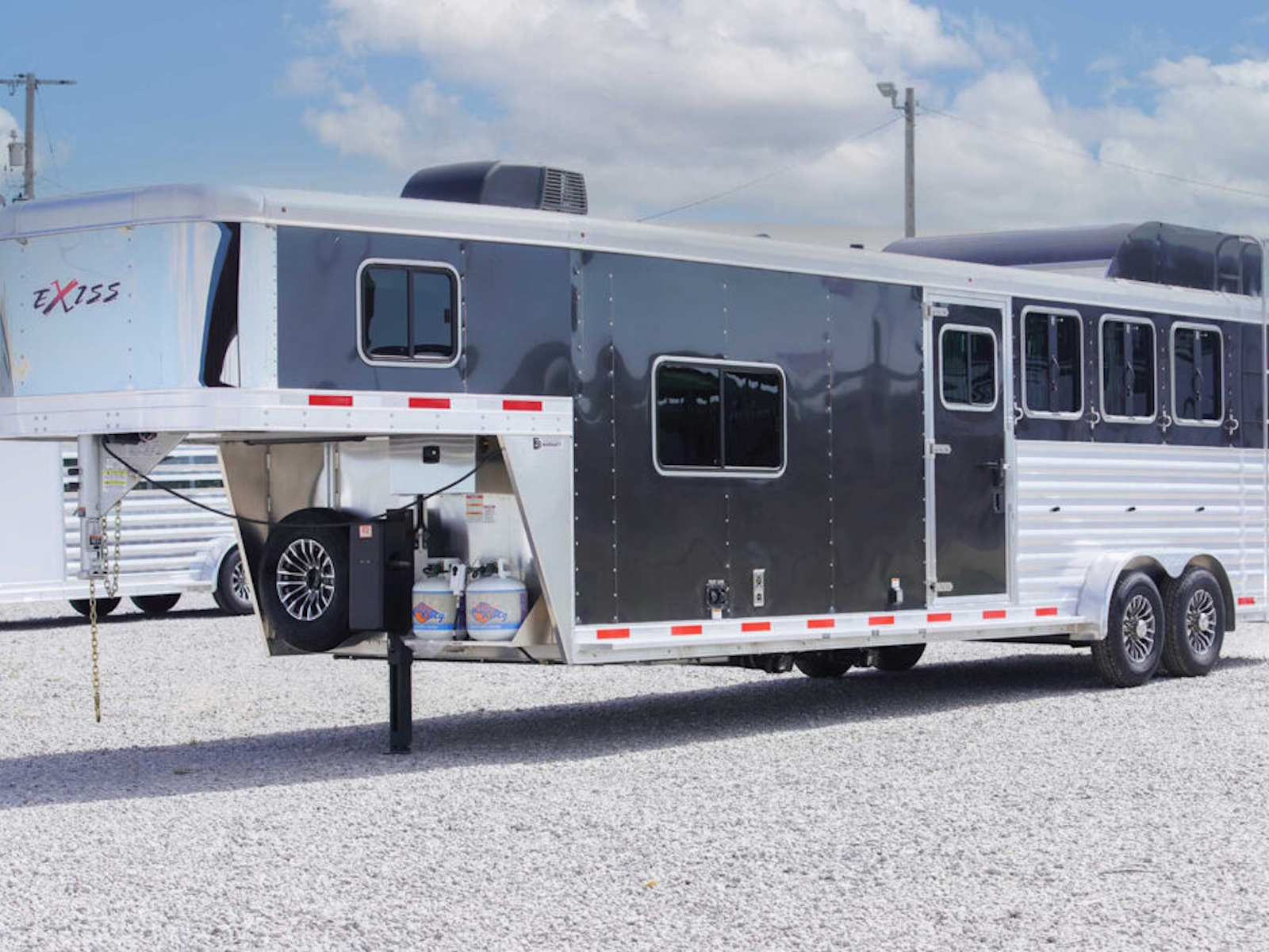 - A convenient electric awning is standard with Exiss living quarters, providing sun protection when relaxing outside your horse trailer. LED lighting is part of the awning for extra light at night.