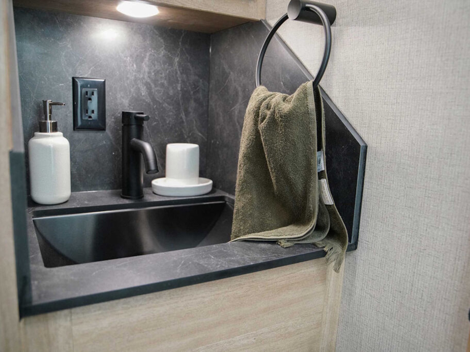 - New modern THINSCAPE® solid surface countertops are standard in Exiss living quarters trailers. The sleek design also comes with superior durability.