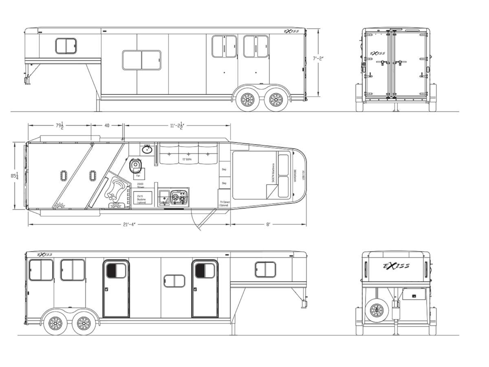 The Exiss Express living quarters horse trailers Models 7211, 7311 and 7411 with 11' living quarters offer an incredible value for today’s horse owner. The stylish living quarters models offer unsurpassed versatility in a cost effective package, giving you the perfect trailer for any adventure! Exterior options include streetside drop feed windows and curbside air gaps (CXF model), air gaps (CX model) or streetside drop feed windows and curbside windows (SS model). For the living quarters, you have the options of our Brownstone Latte, Glacier Ash or Urban Saddle decor packages.