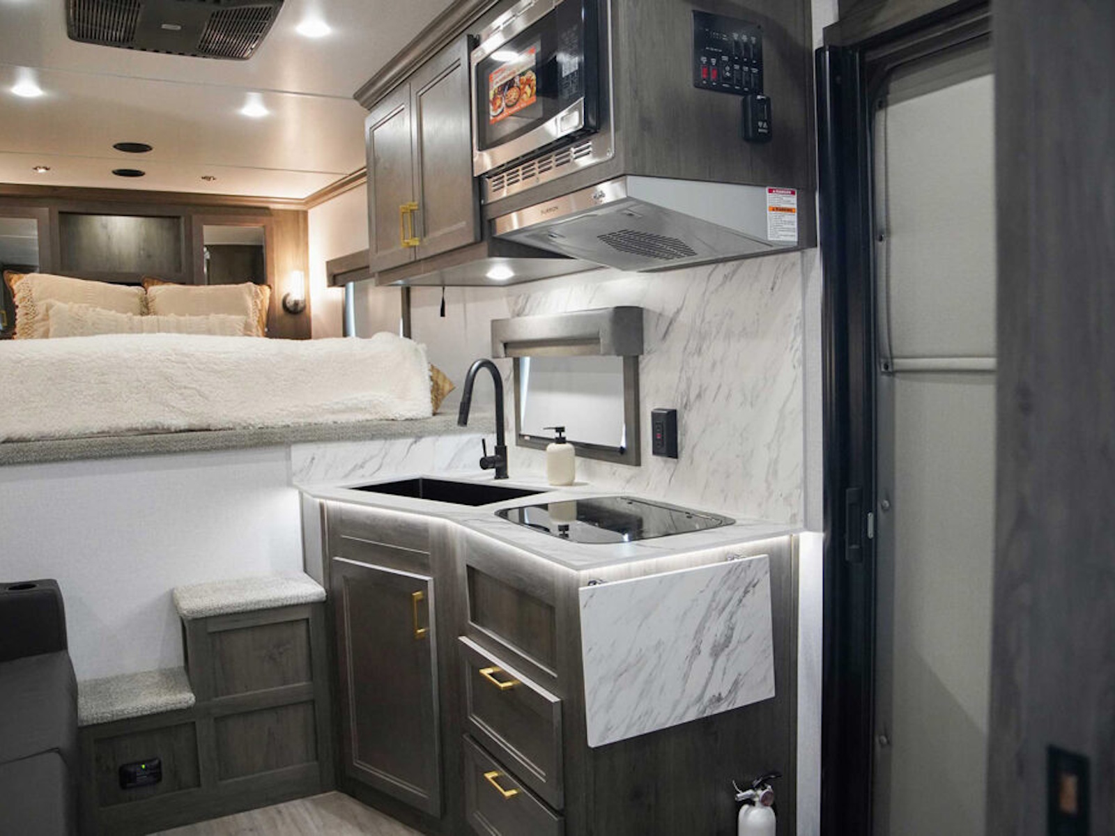 - Exiss living quarters feature an upgraded, larger convection microwave standard, which gives horse owners even more convenience and cooking options when traveling. The kitchen sink is a deep, extra large undermount style with stylish, upgraded faucets. And the recessed stainless steel cooktop stove is convenient and provides an additional flat surface for additional counter space.