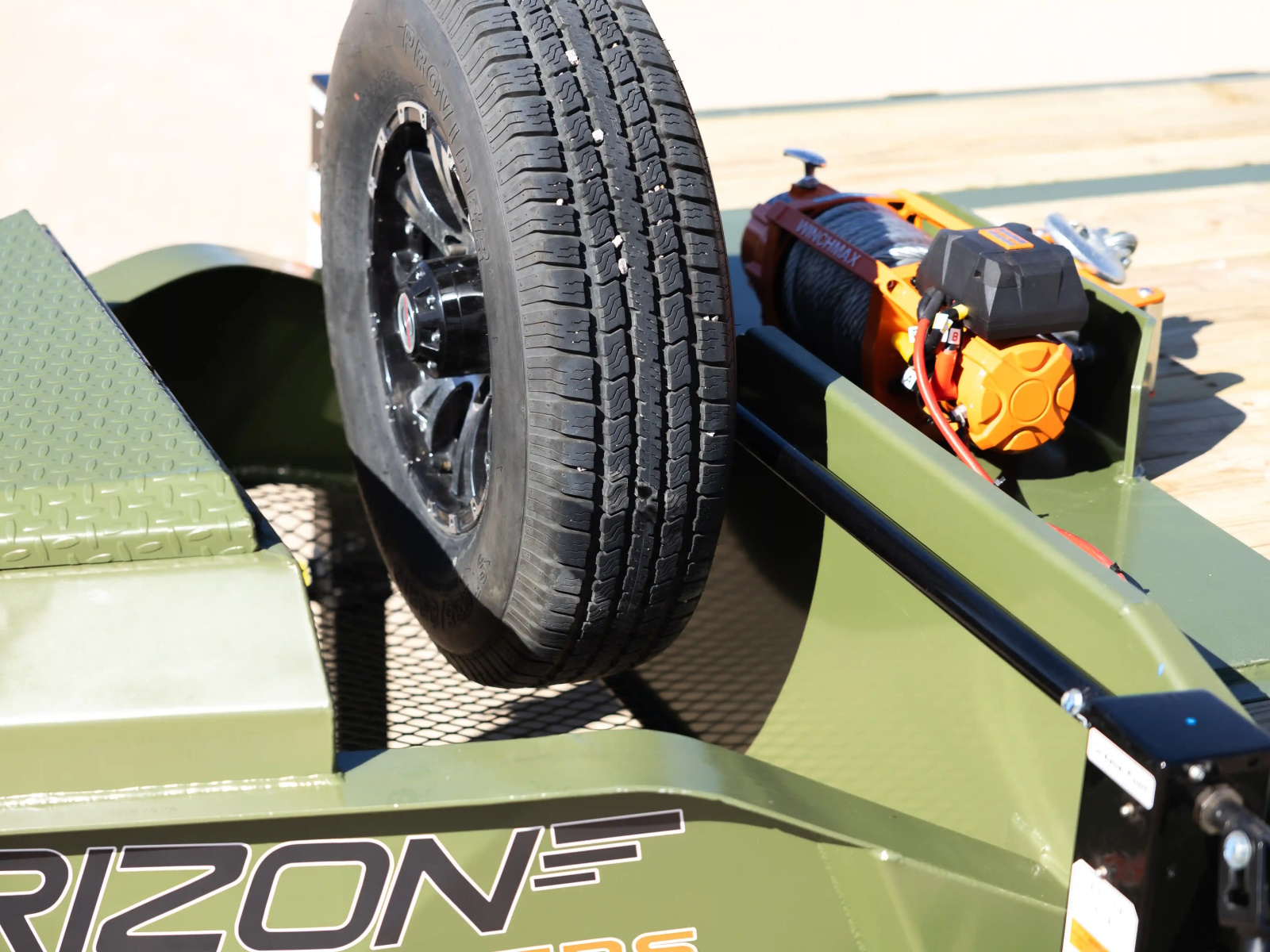 Front Jack: 2 Side Wind Spring Loaded Drop Jack Legs (12,000 lbs) | Toolbox: Diamond Mesh Wire Floor Storage | Left Side: Lockable Toolbox (Houses Batteries And Pump) | Winch Plate: Winch Plate On Deck | Tilt: 18° | Hydraulic System: 2 Button Hydraulic - Power Up / Power Down | Pump: KTI 12V Hydraulic Pump | Controller: 14 ft Control Cable | Wireless Controller: Tuff Wireless 2 Button Wireless Remote | Safety: 3M Dot Compliant Reflective Tape